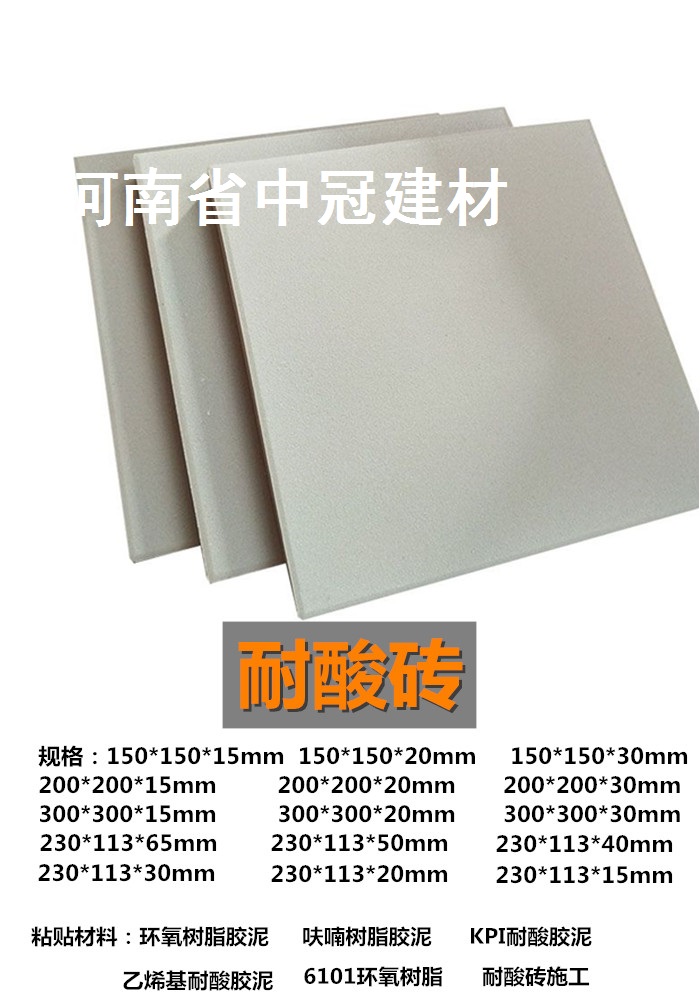 耐酸磚瓷磚是以石英、長石、粘土為主要原料,經(jīng)高溫氧化分解制成的耐腐蝕材料,耐酸解度高、吸水率低,在常溫下不易氧化,不易被介質(zhì)污染等性能,除-及熱磷酸外,對溫氯鹽水、-、---等酸類及在常溫下的任何濃度的堿類,具有抗腐作用。耐酸磚防腐 耐酸,防腐行業(yè)所需要的建筑材料,耐酸磚產(chǎn)品在防腐行業(yè)可使用墻面、地面、塔、池、罐以及露天場地均可使用,耐酸磚使用的環(huán)境不同施工時使用的粘接材料也會有很大的區(qū)別,通常使用的粘接材料有環(huán)氧膠泥、---膠泥等,