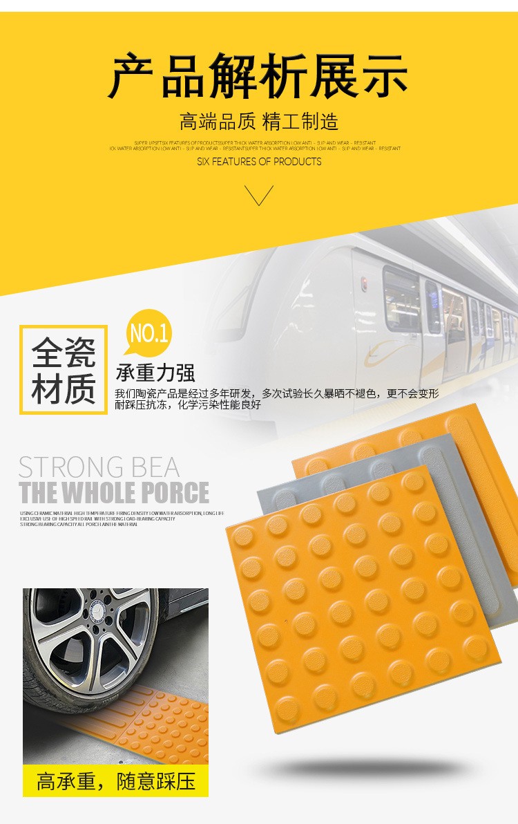 火車站站臺(tái)止步線國家標(biāo)準(zhǔn)寬度是600毫米寬,所以一般盲道磚規(guī)格都是600毫米的倍數(shù),比如有常用的300*300*20.300*300*25,以及400*400;300*400等。 這種盲道磚的成型方法是干粉制胚,壓制成型。